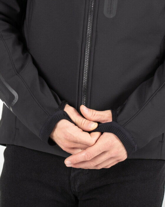 - Měkká poutka na palce jsou důmyslně integrována do rukávu bundy.